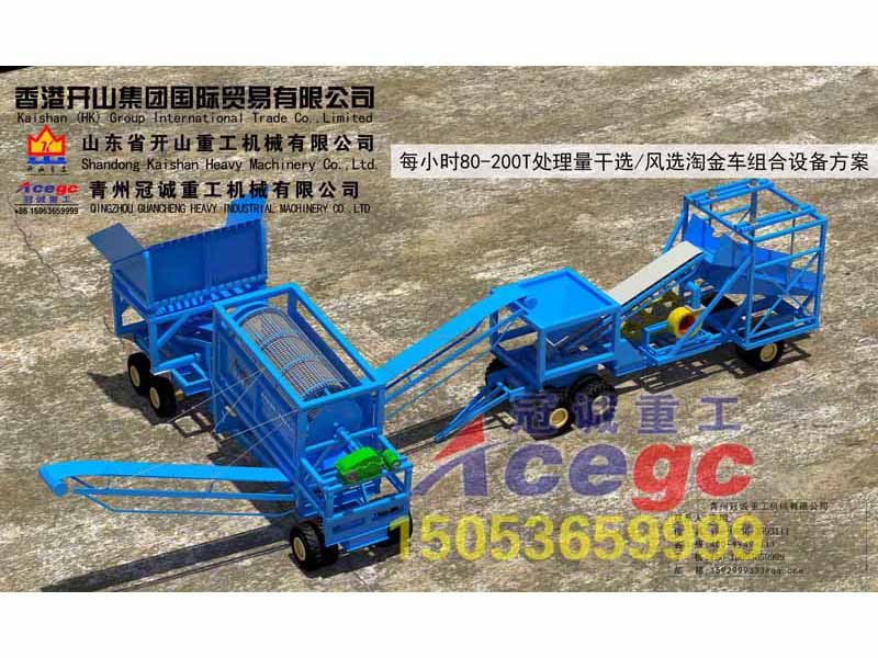 小于8MM的物料由輸送機送入一臺風(fēng)選金淘金車進行風(fēng)力精選,將含金礦料留在搖床內(nèi)部,不含金的廢料排出至廢料區(qū)域;